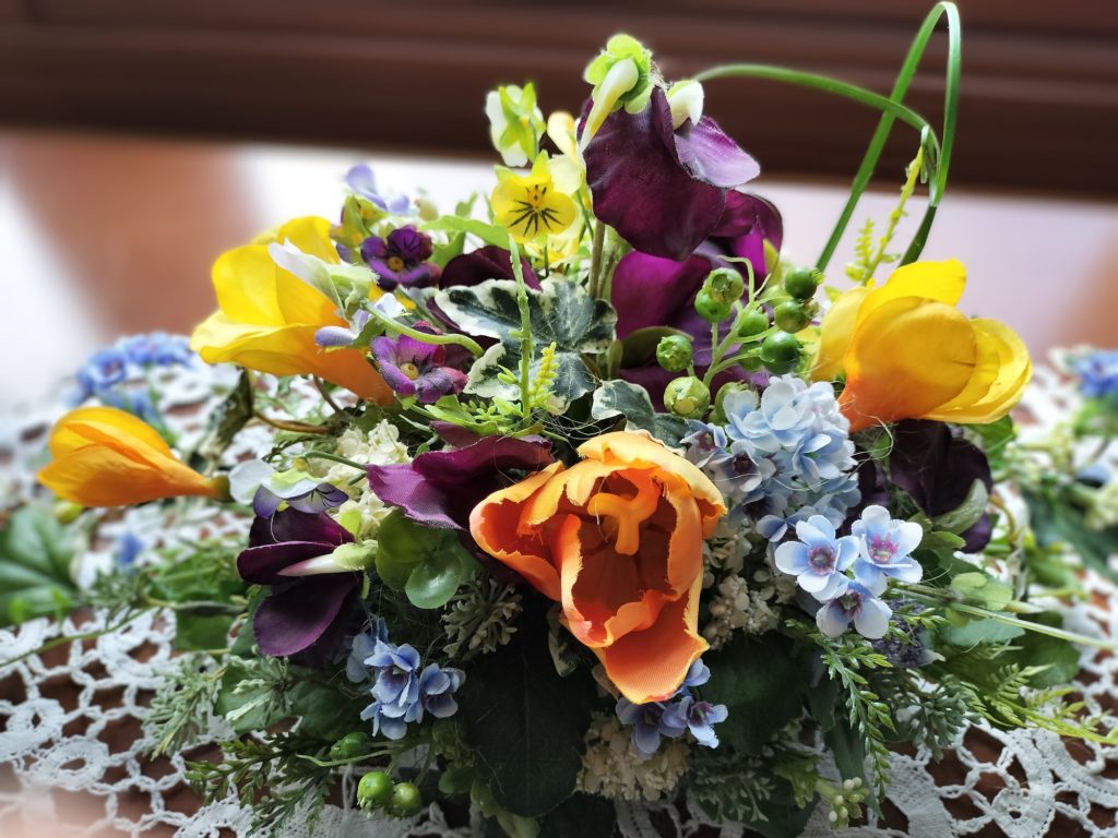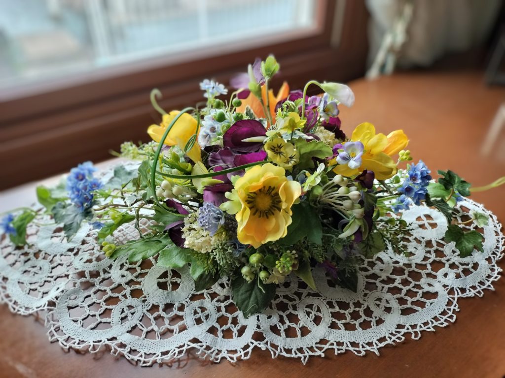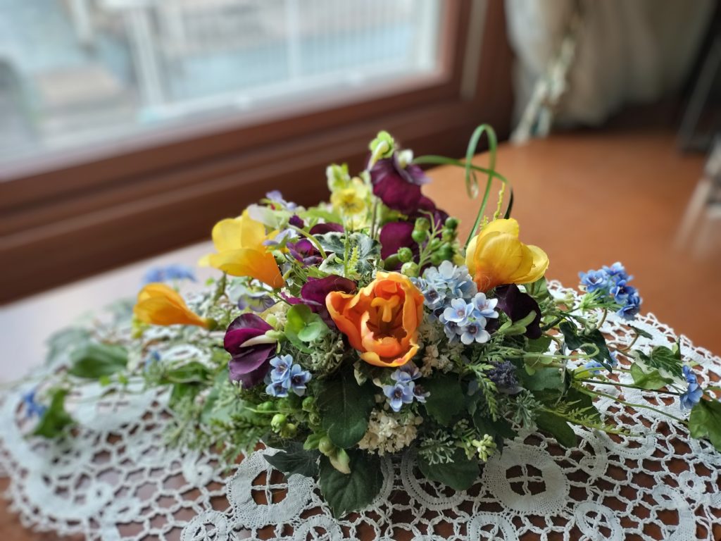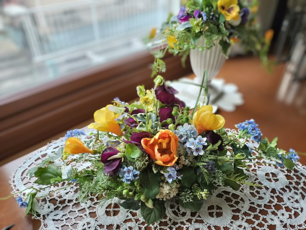 春のお花でアレンジした作品は生徒さん作です。
