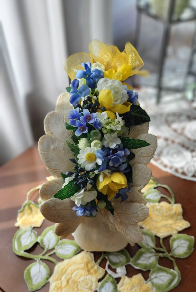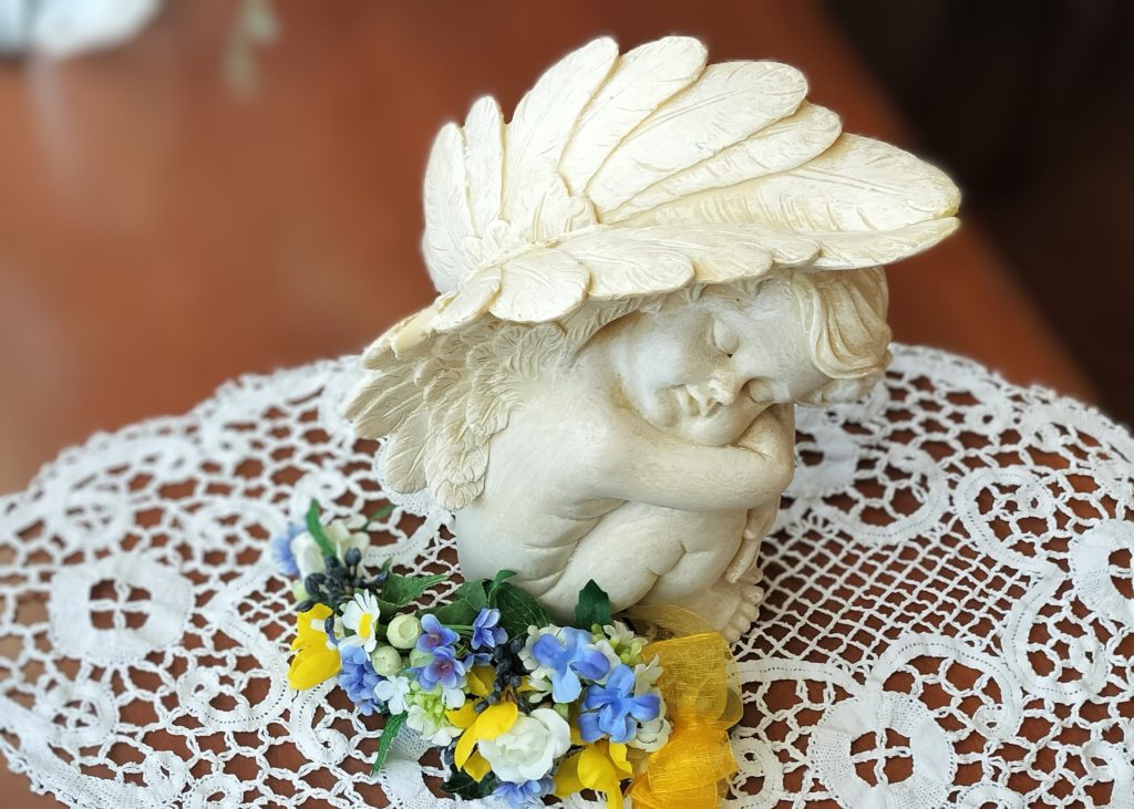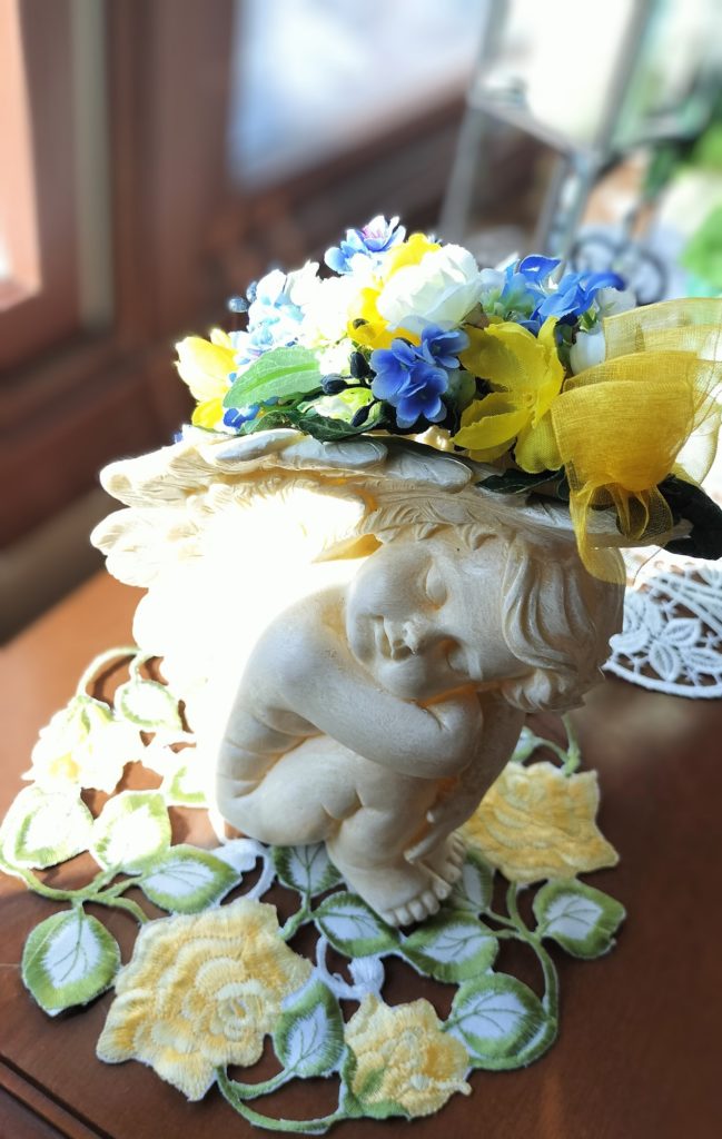 天使の置物の羽にお花を飾ります。