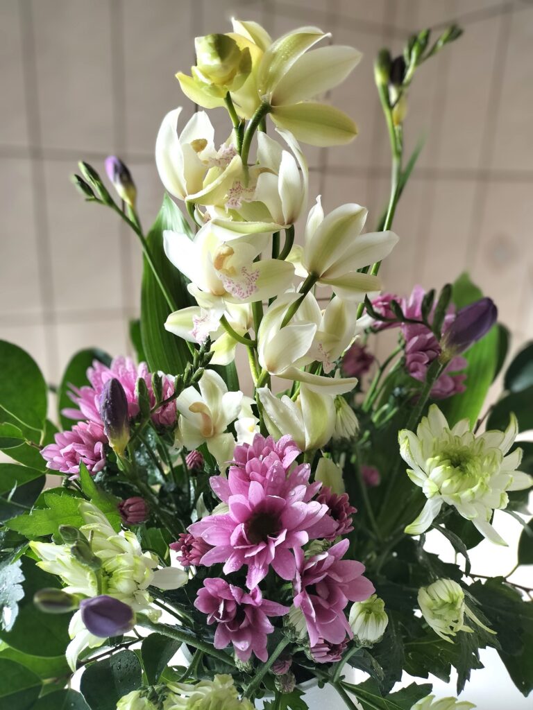 蕾のフリージャやマム。お花たちは満開になるまで、長くお供えできると思います。